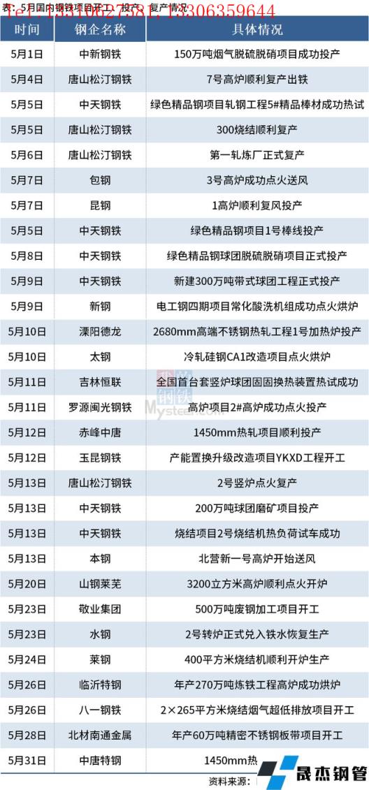 免責聲明:本網站(山東聊城晟杰無縫鋼管廠www.82912.cn)刊載的“5月國內29個鋼鐵項目開工、投產或復產”等均源于網絡,版權歸原作者所有,且僅代表原作者觀點,本文所載信息僅供參考。轉載僅為學習與交流之目的,如無意中侵犯您的合法權益,請及時聯系刪除。本網站刊登此篇文章并不意味著本站贊同其觀點或證實其內容的真實性,我們不對其科學性、嚴肅性等作任何形式的保證。如果侵犯了您的版權,請盡快聯系我們予以撤銷,謝謝合作!