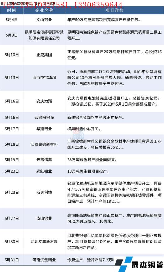 免責聲明:本網站(山東聊城晟杰無縫鋼管廠www.82912.cn)刊載的“5月國內14個鋁項目開工、投產或復產”等均源于網絡,版權歸原作者所有,且僅代表原作者觀點,本文所載信息僅供參考。轉載僅為學習與交流之目的,如無意中侵犯您的合法權益,請及時聯系刪除。本網站刊登此篇文章并不意味著本站贊同其觀點或證實其內容的真實性,我們不對其科學性、嚴肅性等作任何形式的保證。如果侵犯了您的版權,請盡快聯系我們予以撤銷,謝謝合作!