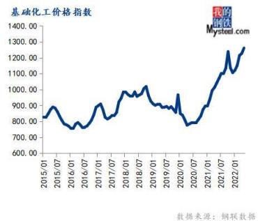 5月份基礎(chǔ)化工價格指數(shù)為1260.63,環(huán)比上漲2.77%,同比上漲21.14%。