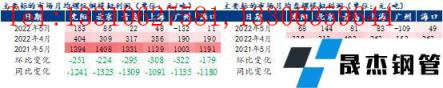從跌幅來看,2022年5月份主要流向市場中螺紋鋼環比跌幅最大的是廣州410元/噸、最小的是上海240元/噸,同比跌幅最大的是海口660元/噸、上海290元/噸;盤螺環比跌幅最大的是廣州380元/噸、最小的是上海60元/噸,同比跌幅最大的是海口600元/噸、最小的是沈陽及北京300元/噸。