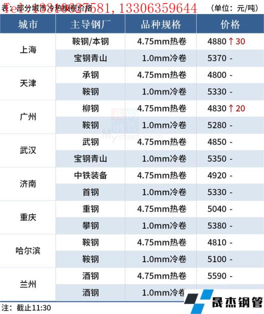 ◎上海:8日早盤熱卷市場價格漲30,現主流報價1500普4860-4880元/噸,1800普4970-4980元/噸;1500錳5010元/噸,1800報5070元/噸左右,2.75Q235B報4980-5000元/噸,2.75SPHC報5060元/噸左右。(單位:元/噸)