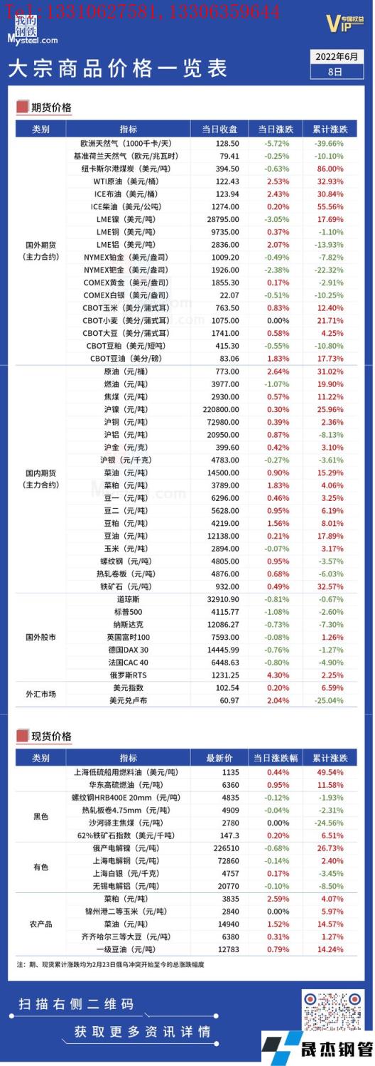 免責聲明:本網站(山東聊城晟杰無縫鋼管廠www.82912.cn)刊載的“俄烏局勢丨大宗商品價格一覽表(6月8日)”等均源于網絡,版權歸原作者所有,且僅代表原作者觀點,本文所載信息僅供參考。轉載僅為學習與交流之目的,如無意中侵犯您的合法權益,請及時聯系刪除。本網站刊登此篇文章并不意味著本站贊同其觀點或證實其內容的真實性,我們不對其科學性、嚴肅性等作任何形式的保證。如果侵犯了您的版權,請盡快聯系我們予以撤銷,謝謝合作!