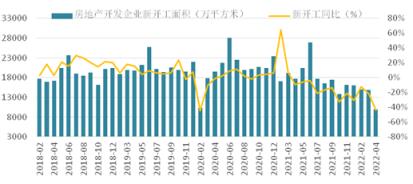 1-4月份,房屋新開工面積39739萬平方米,同比下降26.3%;從單月來看,自去年4月份開始,新開工面積持續負增長,今年4月份同比降幅由上月的22.2%擴大至44.2%,新開工下行明顯加快,對后期施工和行業的投資形成制約。