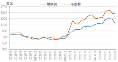 圖6 2019-2022年亞洲螺紋鋼價(jià)格走勢(shì)圖