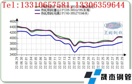 七月份國內帶鋼市場呈現震蕩下行趨勢。月初帶鋼市場價格整體趨弱運行,低價資源成交尚可,期貨市場寬幅震蕩,終端逢低補庫,高價成交疲軟。月中市場價格持續下行,整體成交偏弱,淡季效應顯現導致市場價格大幅走低,下游商貿情緒觀望為主。北方地區小窄帶方面,月末隨期貨震蕩走高,倒掛情況稍有緩解,為維持訂單及正常運轉,被動維持生產。7月帶鋼庫存持續小幅下降,無縫鋼管廠家產量也有所下降,需求端仍未得到改善。南方地區因疫情反復,加之目前正處于傳統淡季,商貿多以觀望為主,隨期貨盤整運行,市場商貿心態不穩,多以降庫為主,終端下游市場仍不景氣,觀望態度濃厚,實際需求延續偏弱,加之下游開工維持低位,帶鋼底部支撐不足。截止至7月29日,華北地區唐山小窄帶報價主流為3950元/噸,唐山355系窄帶鋼主流報價為3860元/噸,天津355系窄帶主流報價為4130元/噸,華東地區無錫355系窄帶主流報價為4050元/噸,華南地區廣州355系窄帶主流報價為4030元/噸。